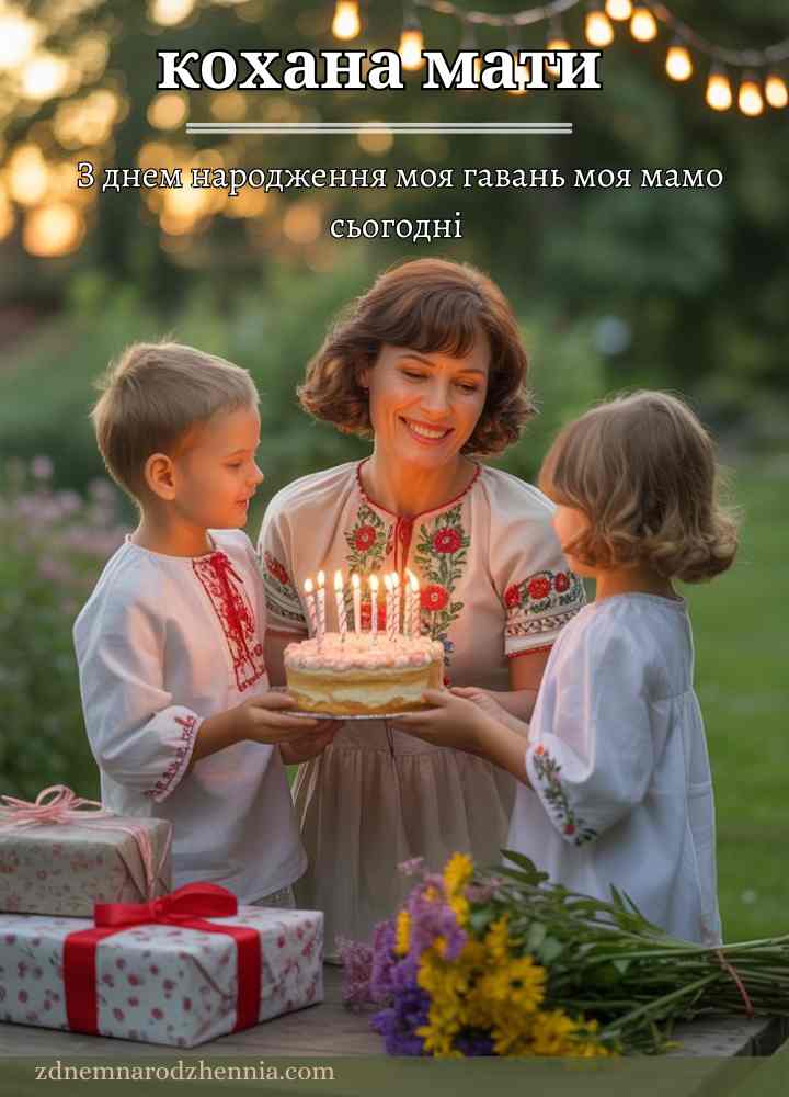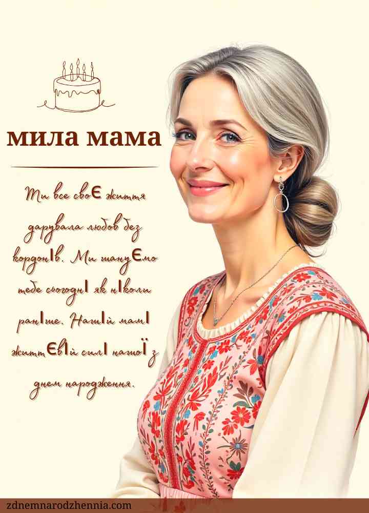 Своєю любов'ю ти перетворила кожен буденний день на щось значуще. Моїй мамі доброму духу який рухає всі мої перемоги з днем народження. Сподіваюся ти отримаєш таку ж любов і увагу яку ти дарувала протягом усього життя сьогодні.