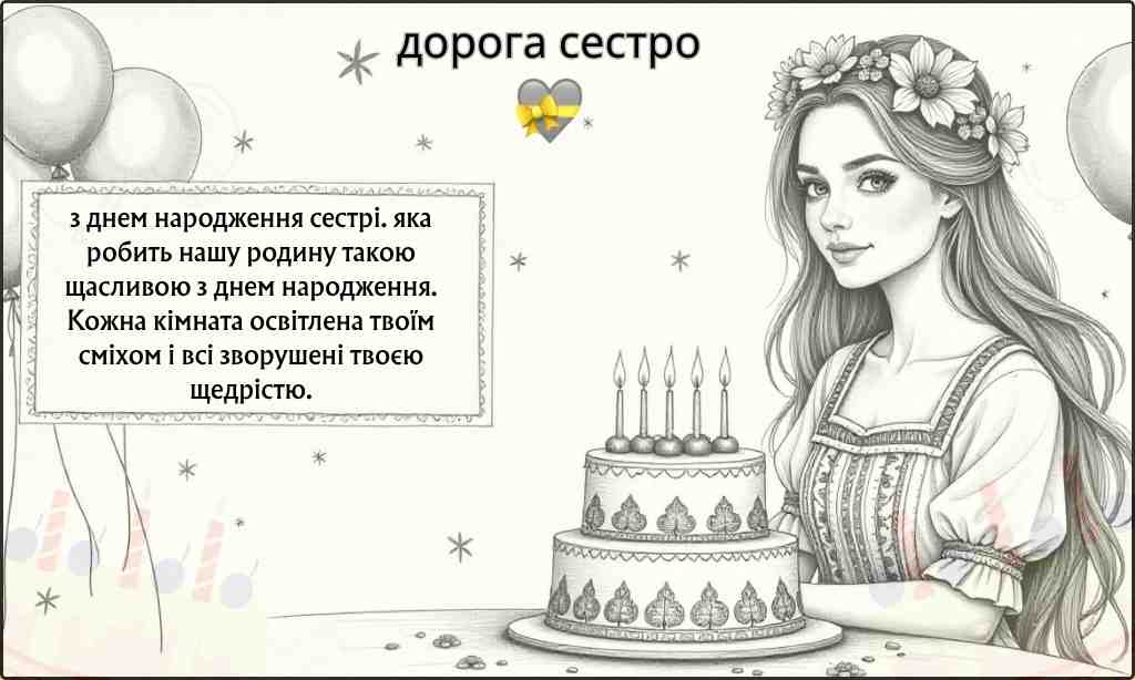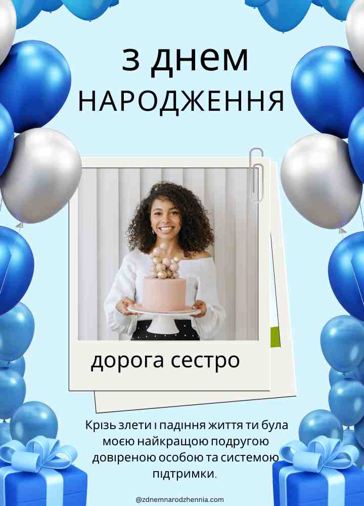 Я вітаю мою чудову сестру з днем народження. Ти показала мені що вразливість може бути силою і навчила мене цінувати безумовну любов. Нехай благословення будуть щедрими у твій особливий день.