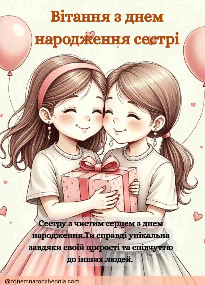 Сестру з чистим серцем з днем народження Ти справді унікальна завдяки своїй щирості та співчуттю до інших людей. Дякую тобі що ти сьогодні моя родина.