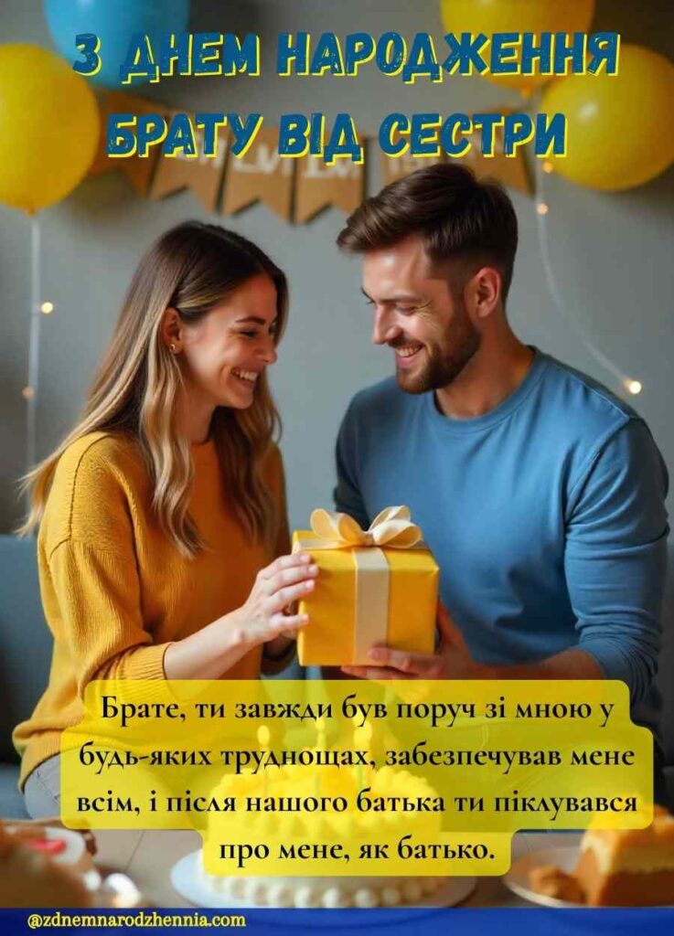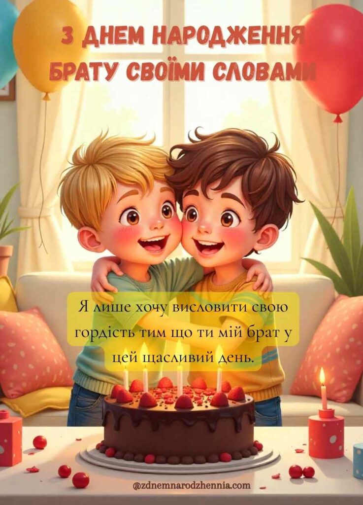 Вітаю брате Я щиро бажаю тобі щасливого дня народження. Я сподіваюся що твоє життя буде сповнене позитивних вражень відданих друзів та яскравих кольорів. Я сподіваюся що у тебе буде міцне здоров’я та удача у всіх твоїх починаннях. Відчувай себе задоволеним та впевненим у собі.